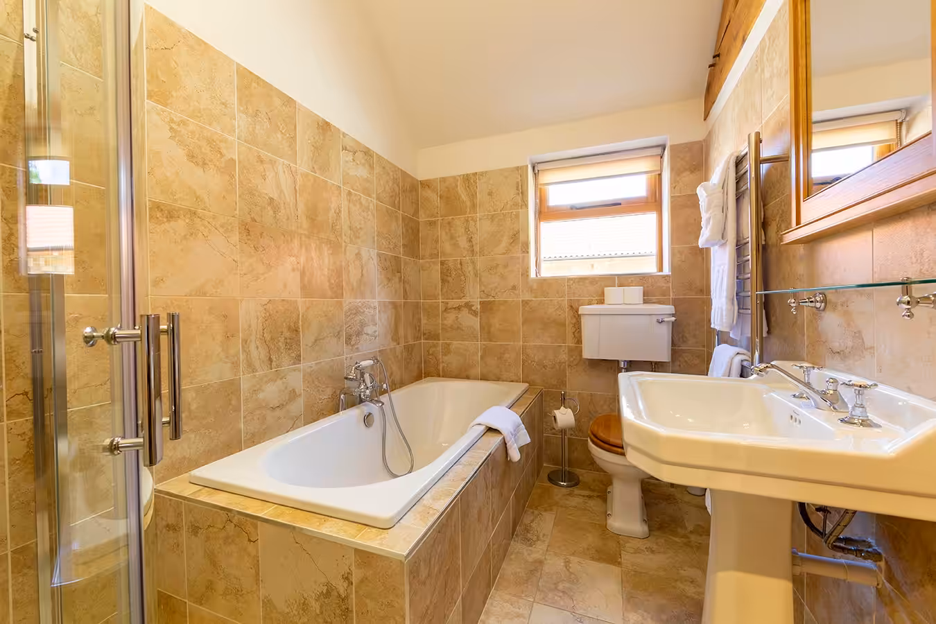 Our Langerhams Suite is one of our double bedrooms with oak beams, light and spacious and appointed to the highest standards, with excellent linens and towels to complement your stay. There is a king-size bed, plenty of wardrobe and drawer space, all set off with delightful furnishings, as in all our suites. Off the bedroom area is an en-suite bathroom, with a generous bath with a hand-held shower, in addition to a separate shower. All our suites benefit from complimentary toiletries throughout your stay.