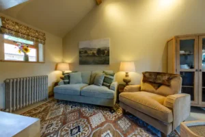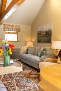 Our Sugar Hill suite is ideal for families or couples wanting a little extra space afforded by the separate sitting room. The accommodation is light and airy with Oak beams in the sitting room and kitchen area. There is a small oak fitted kitchen off the sitting area, complete with a free-standing hob, microwave, air fryer, fridge with freezer compartment, toaster and coffee machine. This is where you will find your delicious welcome pack full of Yorkshire goodies. In fact, everything you need to make yourselves comfortable during your stay. The sitting room has a sofa bed and a comfy armchair, along with side tables, a flat screen TV, and a speaker/sound dock. The double bedroom has a king-size bed, and all conveniences to make your stay super comfortable, a flat screen TV, a large wardrobe and drawer space, a hair dryer and an ensuite shower room with complimentary toiletries for you to use. We are able to provide cots, high chairs, etc., for our little visitors too, please just ask on booking and these items can be made ready available for your arrival.